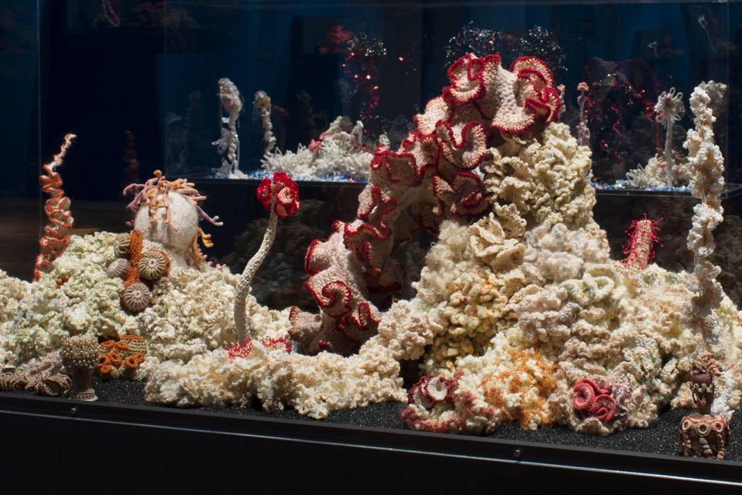 Crochet Coral ReefBleached Reef, at the Museum of Arts and Design (NYC). A project by Christine Wertheim and Margaret Wertheim and the Institute For Figuring. 2019. Photo by Jenna Bascom for MAD.