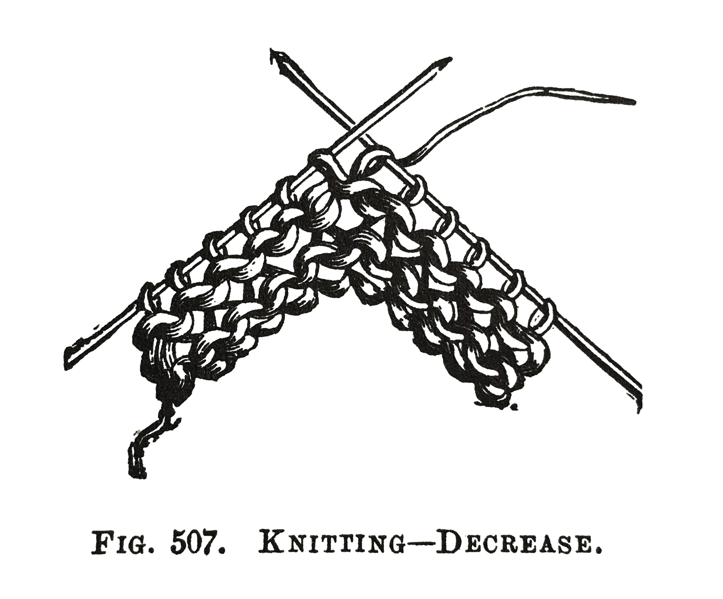 There are several ways of Decreasing, and the methods are also known as Narrowing, or Taking in; but when the word Decrease is used in the instructions without other explanations, it is understood to mean KNIT two stitches together. To Decrease see Fig. 507.
